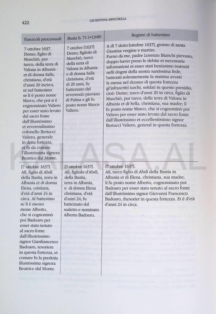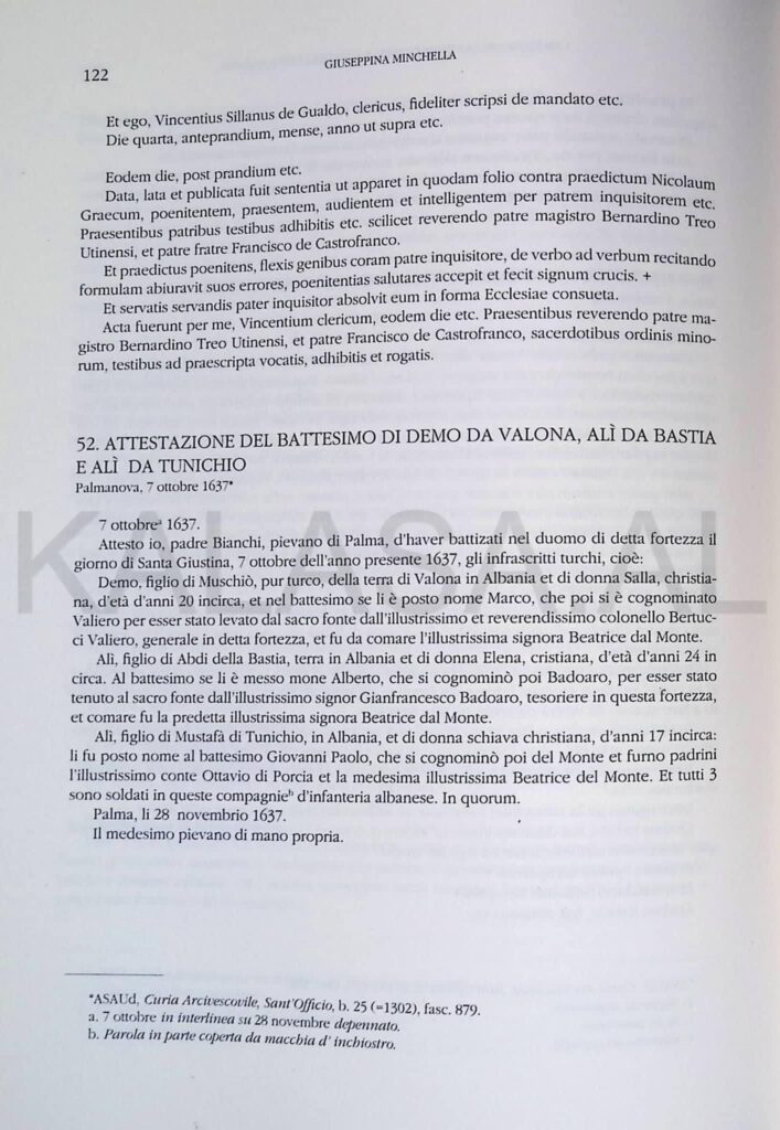 DËSHMI PËR PAGËZIMIN E DEMOS NGA VLORA, ALIUT NGA BASTIA DHE ALIUT NGA TUNIKIO Palmanova, 7 tetor 1637 7 tetor 1637 Dëshmoj unë, Patër Bardhi, famulltar i Palmës, se kam pagëzuar në kryekishën e kësaj kështjelle në ditën e Shën Justinës, 7 tetor i vitit në vazhdim 1637, turqit e poshtëshënuar që janë: Dema, djali i Muskios, turk, nga zona e Vlorës në Shqipëri dhe e gruas Salla, e krishterë, në moshë rreth njëzet vjeç, dhe në pagëzim është shënuar emri Mark, që gjithashtu është vënë mbiemri Valiero që është marrë nga burimi i shenjtë i të Përndriturit dhe të Nderuarit kolonel Bertuç Valiero, general në këtë kështjellë, dhe i është vendosur nga kumbarja e Përndritura zonja Beatriçe nga Monte. Aliu, djali i Avdiut nga Bastia, nga Shqipëria dhe gruaja Elena, e krishterë, në moshë rreth 24 vjeç. Në pagëzim ju vu emri Albert, mbiemri Badoaro, i marrun nga burimi i shenjtë i të Përndriturit zotit Gianfrançesko Badoara, përgjegjës për thesarin në këtë kështjellë dhe i është vendosur nga kumbarja e Përndritura zonja Beatriçe nga Monte.Aliu, djali i Mustafa Tunikio nga Shqipëria, dhe gruaja Schiena, e krishterë në moshë rreth 17 vjeç:Ju vendos emri i pagëzimit Gjon Pali, ju dha mbiemri del Monte dhe kumbarët janë i Përndrituri konti Ottavio di Porçia dhe e Përndritura Beatriçe del Monte.Dhe të tre janë ushtarë në këtë kompani të këmbësorisë Shqiptare. Të bashkuar.Palma, me 28 nëntor 1637 Un famulltari me dorën time. —————————————————————————