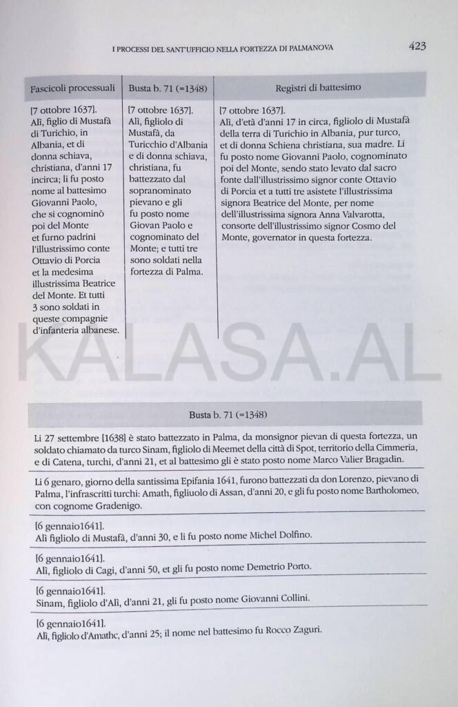 📌 Në një dokument pagëzimi në librin e Giuseppina Minchella, përmënden 3 ushtar shqiptar që shërbenin në vitin 1637 ,në kalan e Palmanoves Itali. emrat e ushtarve janë Demo nga Valona ( Vlora ) 20 vjeç ,Aliu nga Bastia ( Sajava ) 24 vjeç ,dhe Aliu nga Turriqi ( Kalasa ) 17 vjeç .Te tre ushtarët shqiptar u pagëzuan në të njëjtën dit. Te dhena per Aliun nga Turriqi ( Kalasa ) Aliu qe 17 vjeç kur u pagëzua ,emrat e prindërve babai Mustafa mysliman,nëna Schiena ( Çina ) Kristiane.Aliu ishte ushtar në Palmanova të Italis në 7 tetor të vitit 1637 u konvertua nga mysliman në kristian ,mori emrin Giovanni Paolo dhe mbyemrin del Monte emrat e kumbarve të Aliut Ottavio di Porcia dhe Beatrice del Monte. 📌 Emri i Aliut dhe i Çinës egziston dhe sot në Kalasë .Dy ura guri kan emrat e tyre Ura e Çinës dhe ,Ura e Ali Voglit.