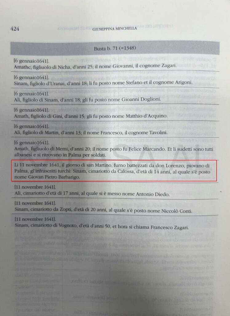 📌 Në një dokument pagëzimi në librin e Giuseppina Minchella ,I aprocessi del Sant’Ufficio nella fortezza di Palmanova 1595-1669, përmëndet nje djal 14 vjeç nga Kalasa e Himarës me emrin Sinam-Sinan mysliman ,ai u pagëzua mori emrin Gjon Pietro Barberigo Në vitet 1595-1669 jan vendos shum shqiptar nga krahina e Himarës në Palmanova Itali PËRKTHIMI PLOT NGA ORIGJINALI Me 11 nentor 1641, ditën e Shën Martinit, është pagëzuar nga Don Lorenci, frati i Palmas, turqit e nënshkruar: Sinam himariot nga Kalasa, në moshë `14 vjeç, dhe ju ka vu emri Gjon Pietro Barberigo.